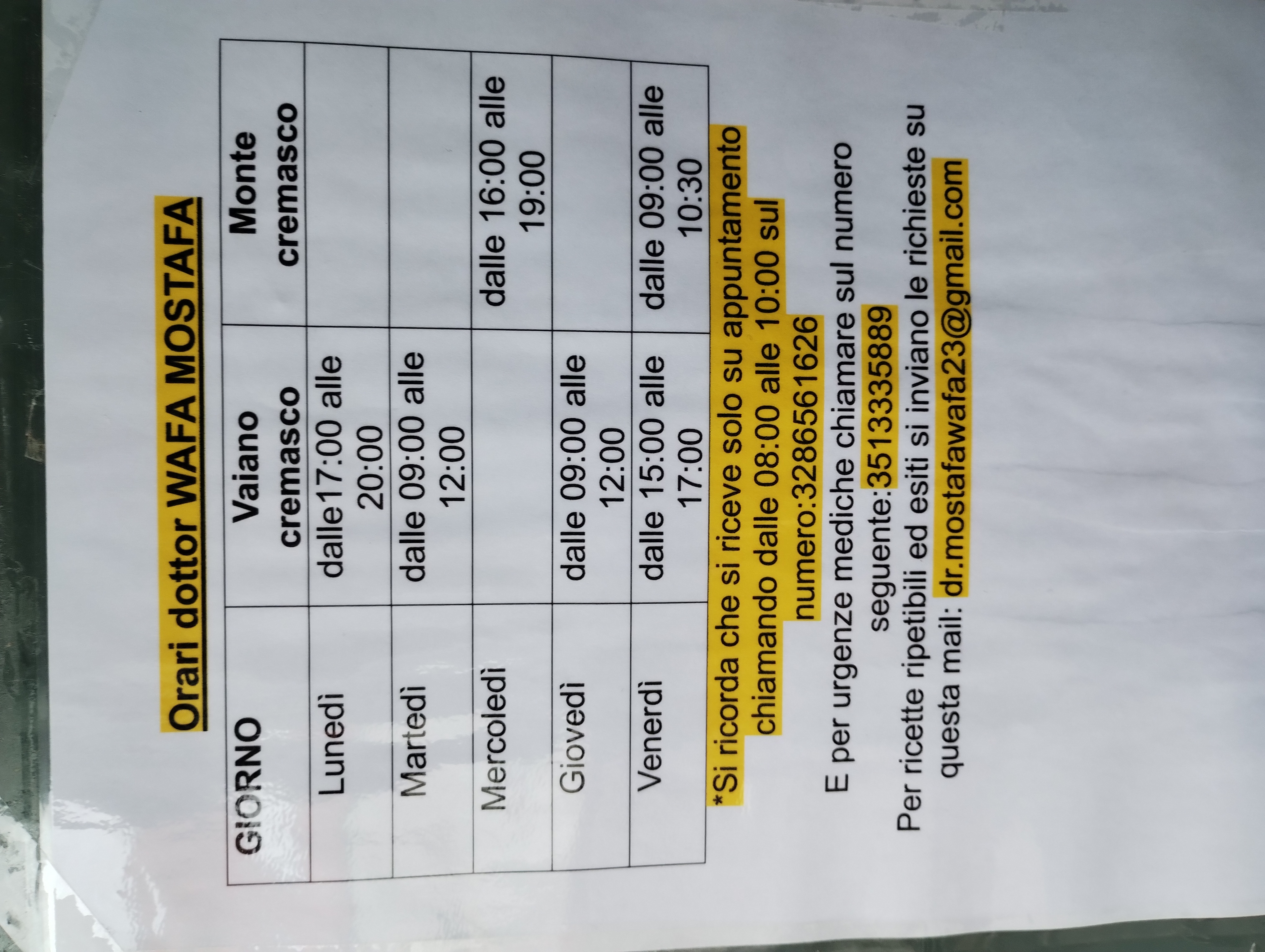 A seguito delle dimissioni del Dott. Carniti Ennio, Medico di Medicina Generale nei Comuni di Vaiano Cremasco e Monte Cremasco a far data dal 15/05/2023, si avvisano gli assistiti che in nuovo medico incaricato è il Dott. Wafa Mostafa.